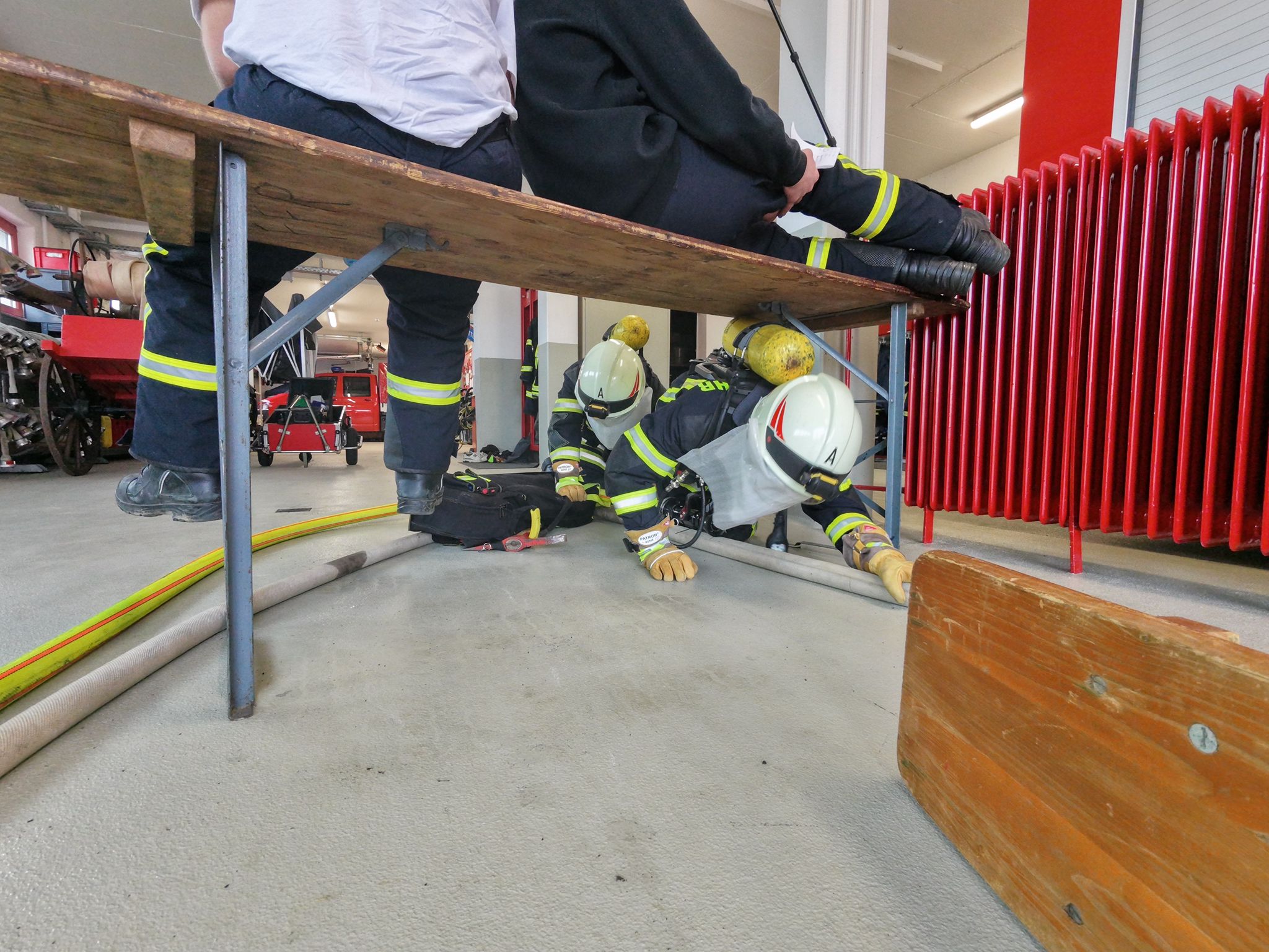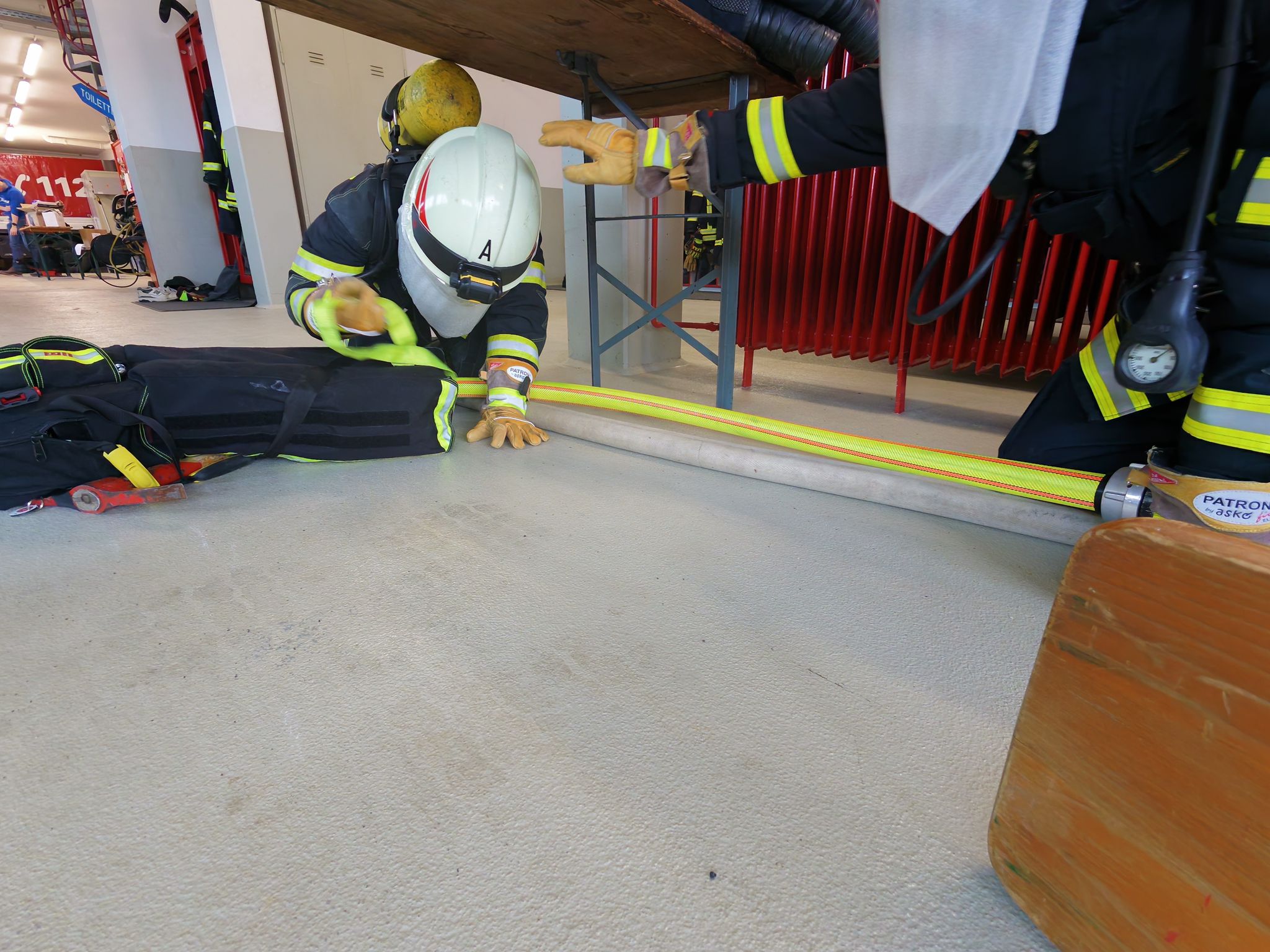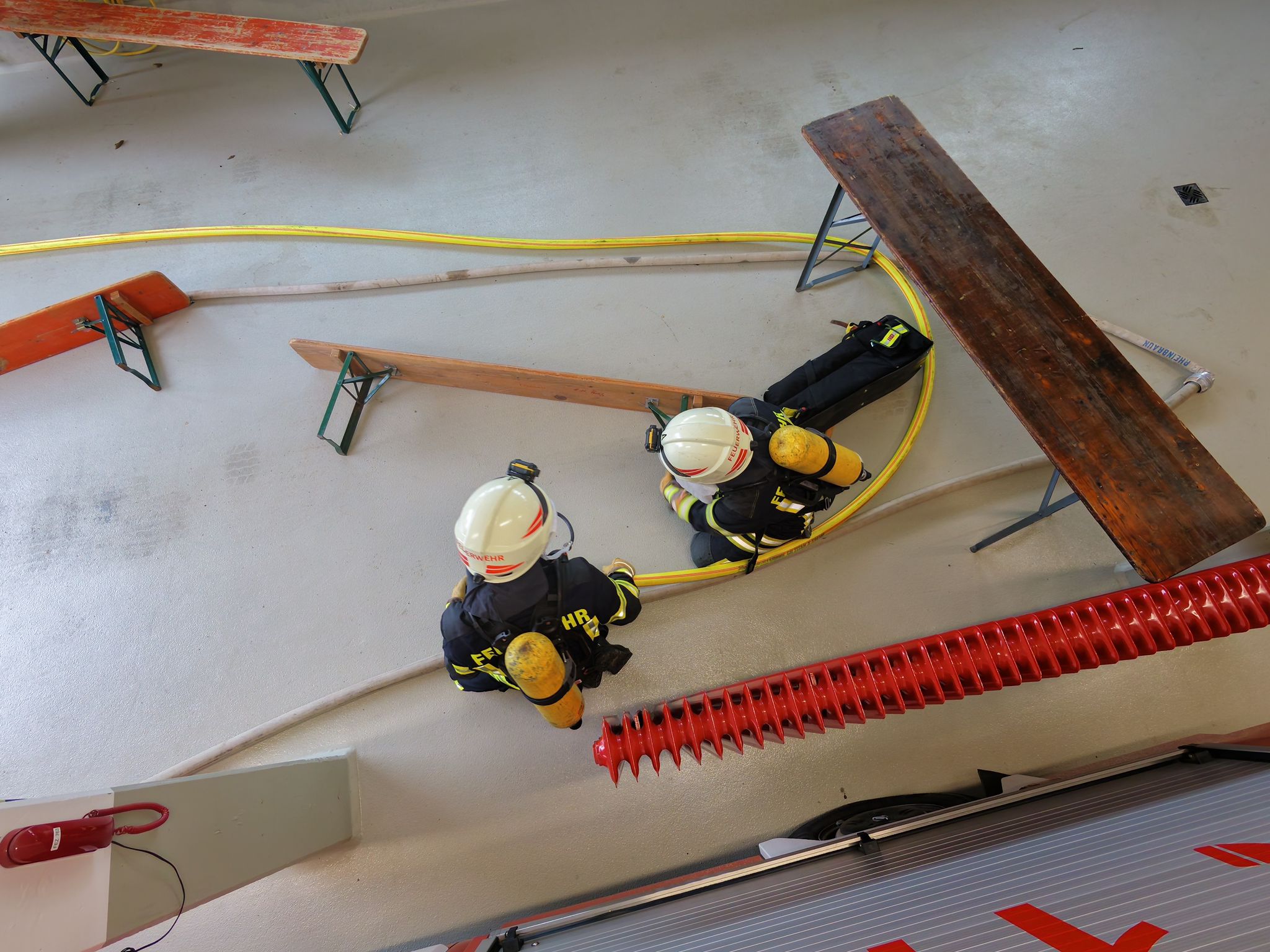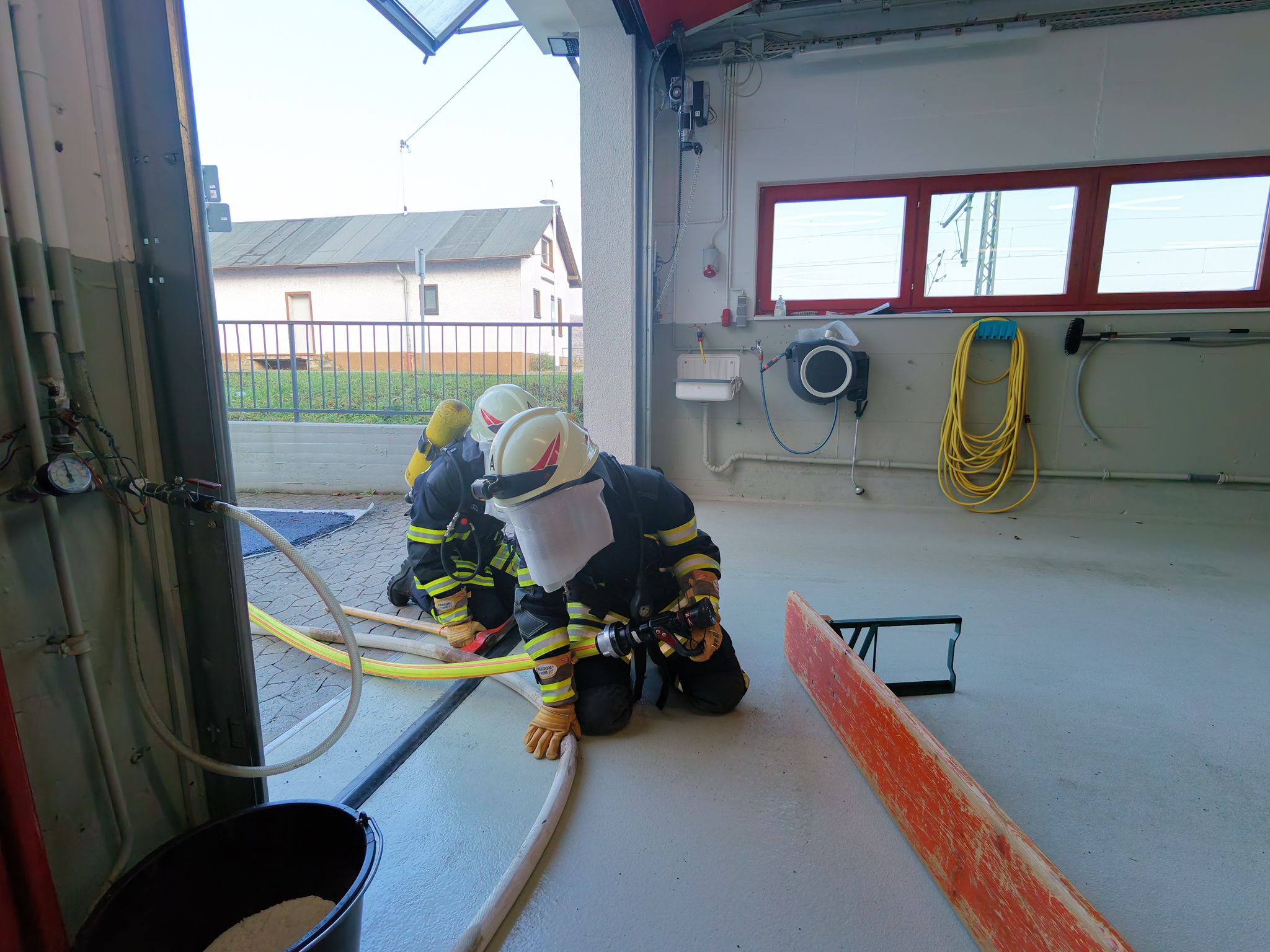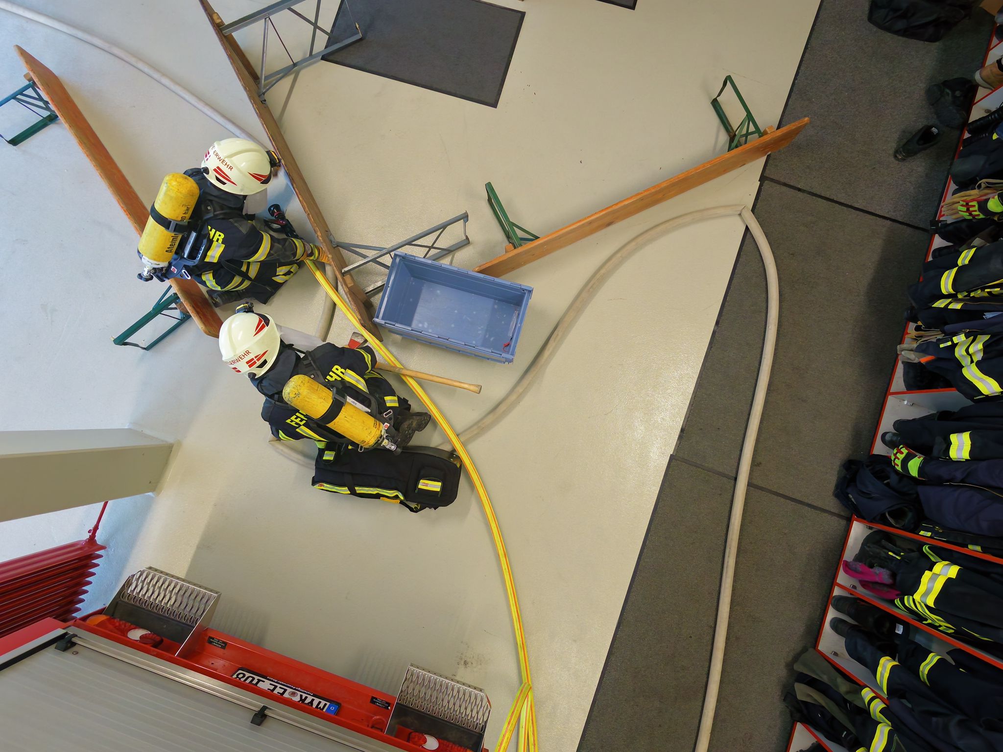 Zunächst wurden die Grundlagen in einer theoretischen Ausbildung wiederholt und besprochen. In der darauf folgenden Ausbildung ging es um die praktische Umsetzung. An zwei Stationen wurden verschiedene Szenarien geübt. Zum einen ging es um das Schlauchmanagement und das richtige absuchen von Räumen.